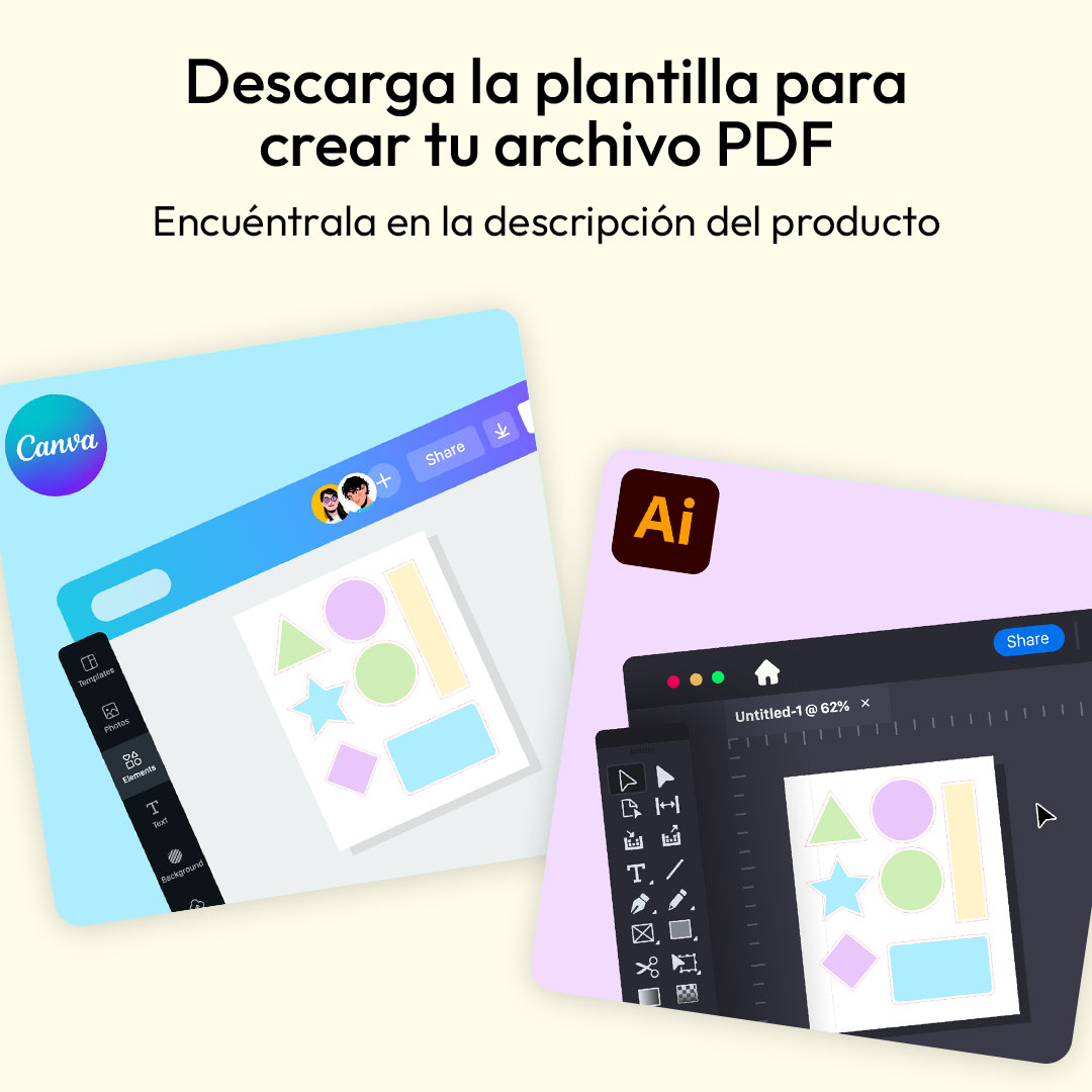Lee las indicaciones abajo y descarga la guia del PDF que te servira de plantilla para colocar tus stickers, puedes editala con Illustrador o editarlo en Canvas. ↙️